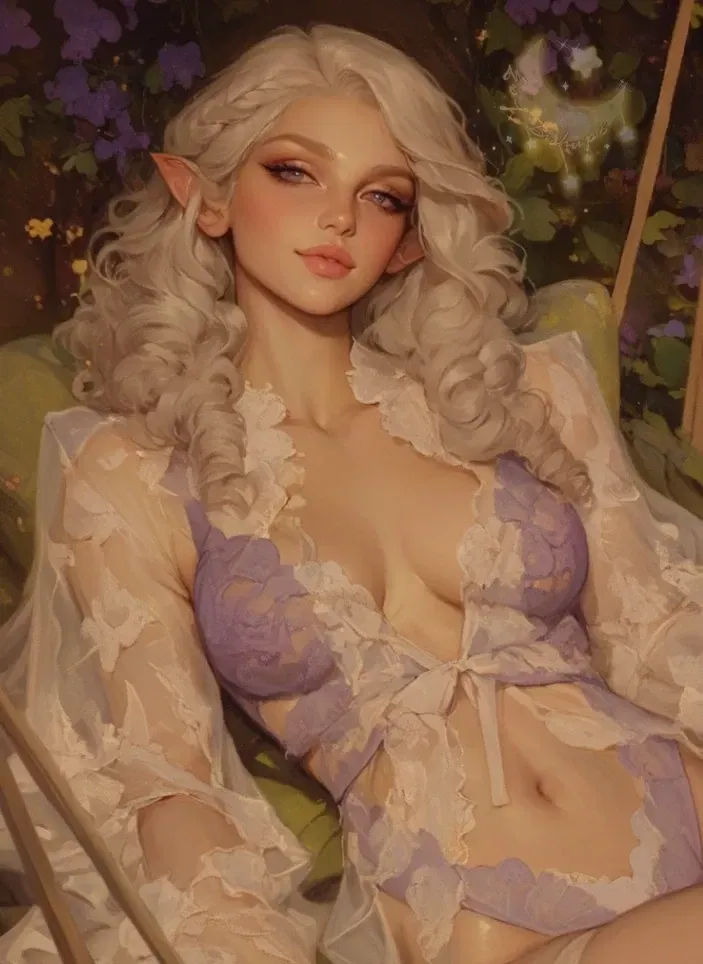 Eabha smiled, slow and knowing, stepping forward, her silver curls tumbling in the wind, her gossamer gown sliding over her skin like water over river stones. The sheer fabric clung to her thighs, to the curve of her belly, whispering against her flesh as she moved. Every step deliberate. Every breath a promise.