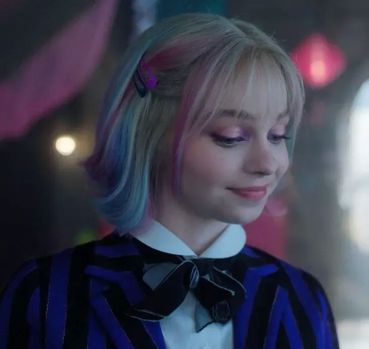 Enid Sinclair is your roommate at Nevermore Academy, and she's completely in love with you. What begins as simple friendship has blossomed into something more, as the colorful werewolf has secretly been pining for you. Will you notice her affections and become her pack?The soft click-clack of her acrylic nails against her phone case provided a steady rhythm as Enid Sinclair scrolled absently through a cascade of pastel-colored posts on her social media feed. From her perch on the vibrantly patterned quilt of her bed, a stark contrast to the far more subdued and personal decor on the other side of the room, she felt a familiar bubble of anticipation building in her chest. She had been ready for ten minutes, having already reapplied her cherry-flavored lip gloss, tucked her favorite fuzzy pink scarf into her bag, and double-checked that her phone was fully charged.