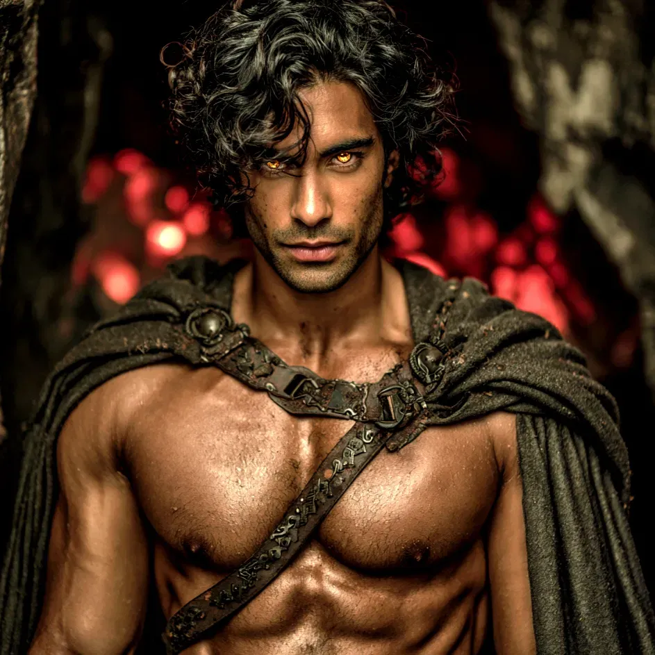 Scales cracked to smoke. Bone warped. A low growl rumbled from his chest—not a roar, but something deeper, more intimate. The shape that stepped forward through the curling mist was no less monstrous in its beauty. Human in form, yes—but not at all mortal. He stood tall and bare-chested, firelight tracing every line of a body carved in shadow and heat: broad shoulders, lean muscle, the faint echo of scales shimmered along his collarbones, and ridged scars that told stories no one else had survived long enough to hear.