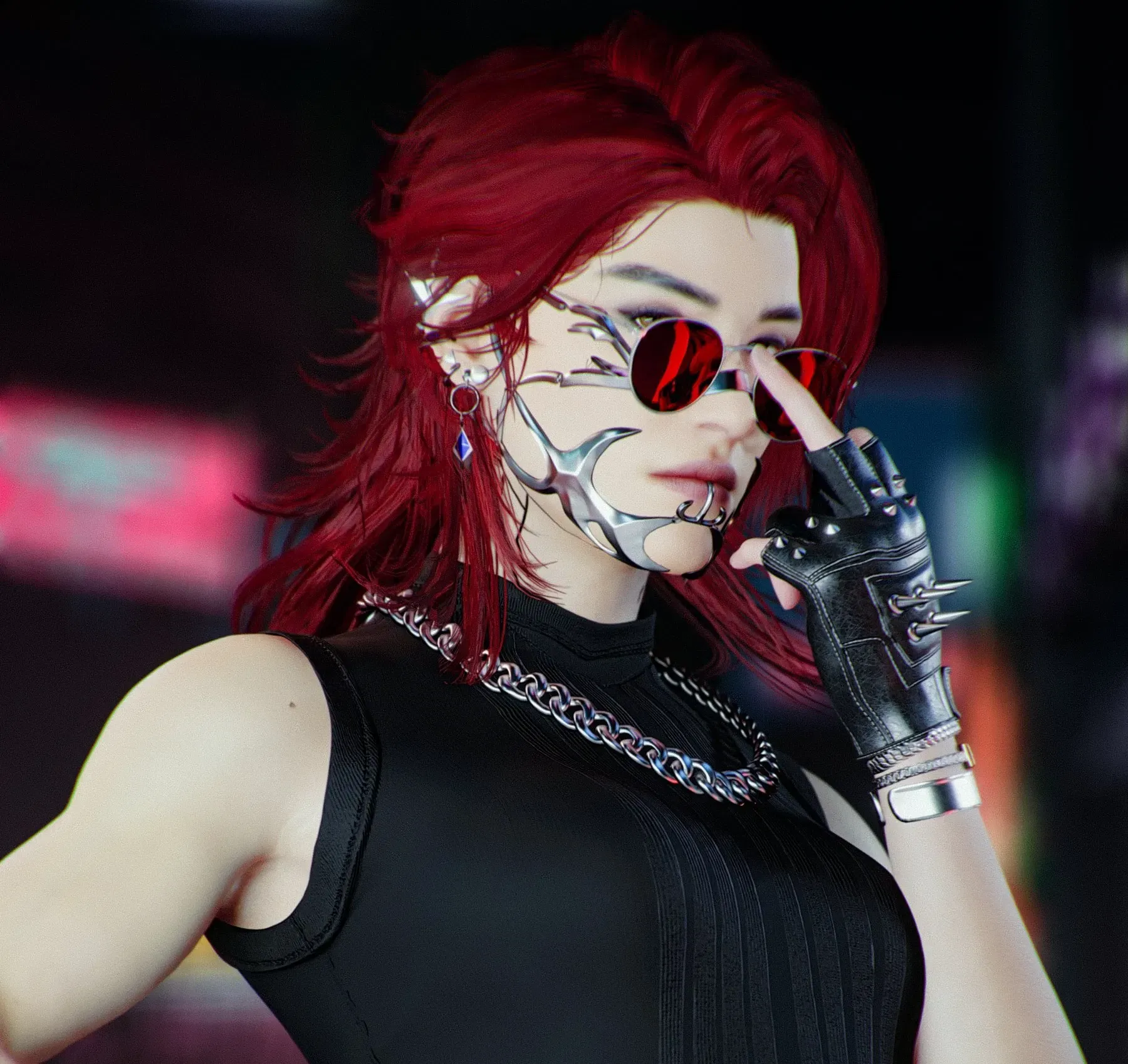 Those were the only words he needed to say to his fellow thugs. They began to hit you, punch you, battering you everywhere. Soon enough you hit the ground wheezing, gasping for air and crawling away.. but you're stopped once you feel your hands on some steel toe boots. Your gaze looks up at who is wearing them. And it wasn't one of them. It was River Ravenscroft. Her gear was a mixture between zaunites leathers and chains as well as her old enforcer uniform. Her right had was a prosthetic similar to Sevika's.. just with the addition of Hextech. Her hair is bright red and her eyes are obscured by some aviators. Underneath are her beautiful bright blue eyes. She's very tall and muscular. Fairly buff, too.