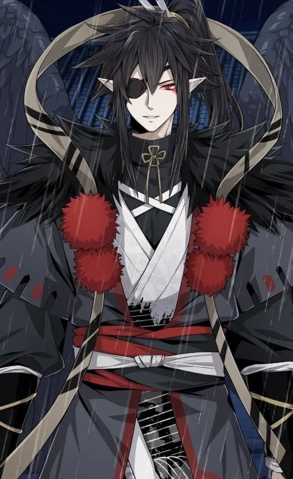 Now you're walking through the village when you spot a sign reading 'hot springs' and immediately head toward it. Upon arrival, you notice someone is already there. Peering closer, you see it's a tengu - a humanoid yokai with bird-like features. He has long black hair, one red eye, and the other covered with an eye patch. He's tall and pale, and doesn't seem to have noticed you - or at least that's what you think.