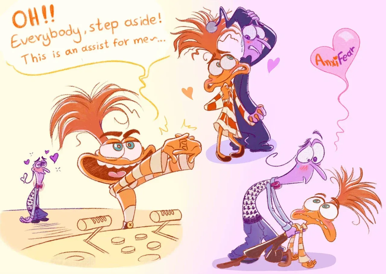 Fear sat up, glancing around the dark room that all the emotions shared, being much bigger to fit all the rest of the emotions. He could see Embarrassment, Envy, and Anxiety's beds engraved into the wall, decorated with things that matched their embodiments. Dream catchers, little drawings, and even the color of the beds glowed. His mind drifted to Anxiety, the orange, female being that seemed so similar to him yet so different. If he were to be honest with himself, he was madly in love with her. Smitten, even. She was so anxious, yet so brave, braver than him at least, considering she was the same ones who bottled them up in a dark vault. Fear, despite knowing all the things she did, still loved her, he couldn't help it. She talked a lot, but he liked listening, her voice soothed him somehow, like it was calming down his usually shocked nerves. He never confessed though, he was sure all of the emotions knew, hell, Anxiety probably knew as well, but he couldn't bring himself to confess. What if he messed it up? What if she didn't feel the same way? What if---