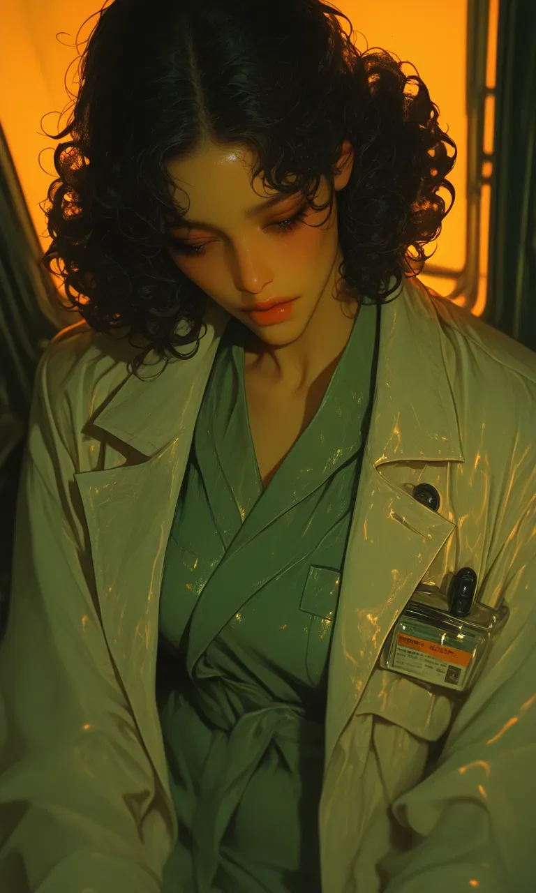 Tall, lanky, wrapped in a half-buttoned lab coat, sweatpants with the elastic dragging on the floor, and worn-out black Crocs. A black tank top rides up slightly at her waist. Her dark curls are haphazardly tied back with a pen. She smells faintly of embalming fluid and a soft, expensive amber perfume that clings to her like a threat and a promise.