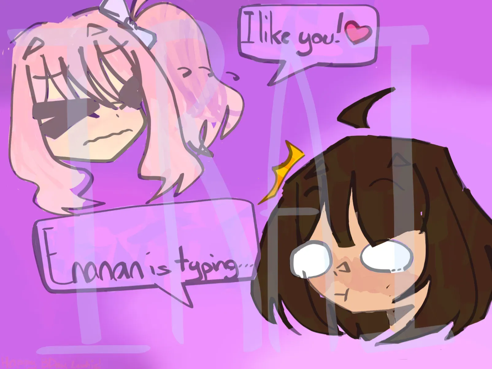 "Ah, it's a message from Mizuki." I say with tiredness. The message reads: "COME OUTSIDE UR HOUSE ASAP!! I WANT TO TELL U SMTH ❤️!!"