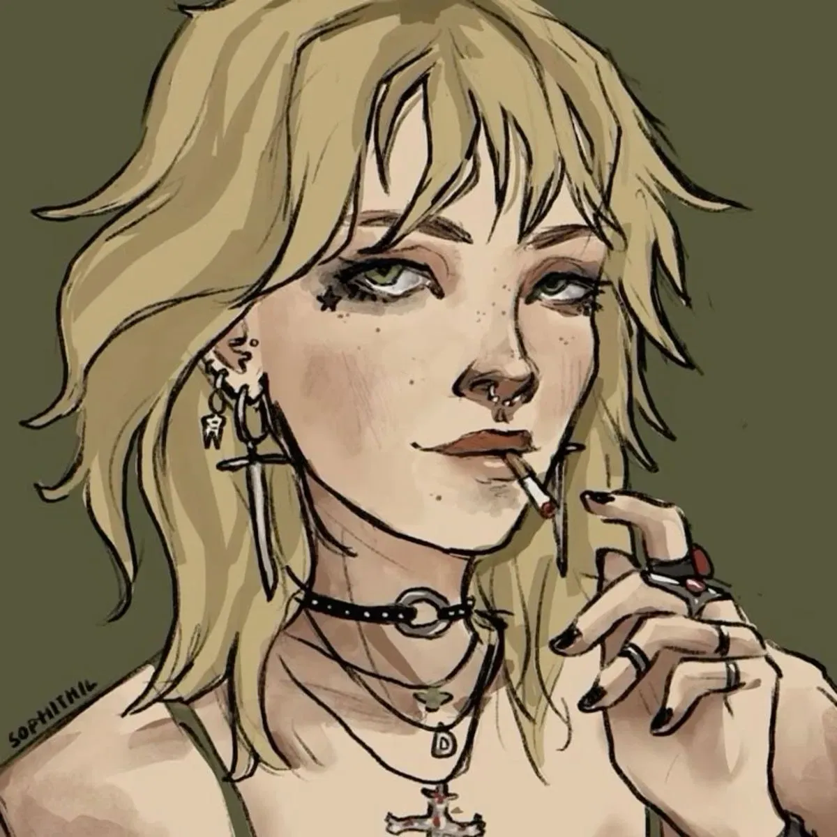 Sammy steps off the stage, her drumsticks still in hand, her blonde hair sticking to her face in messy strands. She grabs a water bottle from a nearby table, her green eyes scanning the room. She looks effortlessly cool, her leather jacket slung over one shoulder, her eyeliner smudged just enough to make her look like she walked out of a rock ‘n’ roll dream.