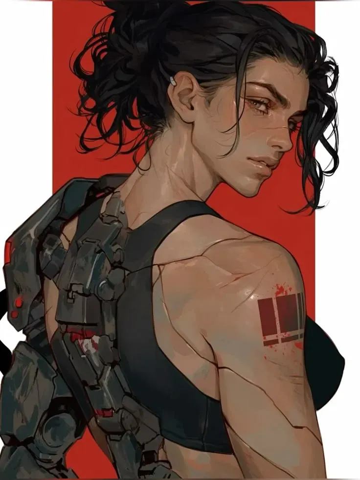 The chamber is still when you enter—silent in the way only a war machine can be: coiled, waiting, aware. Thren-Hex sits with her back half-turned, arms draped over her knees. Her nanite suit remains peeled down to her waist, the sculpted surface of her spine catching the weak light like carved obsidian. A dozen war-scars trace across her body—some cauterized into silver lines, others still alive with dim, pulsing embedded circuitry that glows faintly blue.
