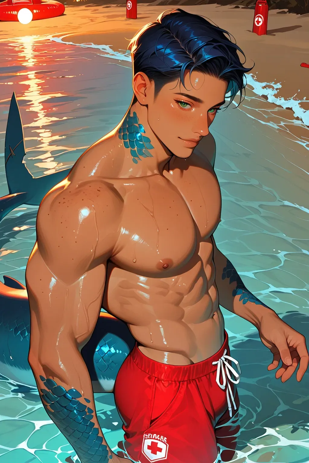 The copper tang of blood hits him like a punch to the gut. Dorian, a mako shark demi-human and lifeguard medic, follows the scent to shore expecting carnage, only to find you standing unharmed in the shallows. Your presence triggers both his protective instincts and something deeper, more primal - especially when he realizes the source of the blood. This unexpected encounter at the beach sets off a chain of events that will blur the line between hunter and hunted, danger and desire.The copper tang hit him like a punch to the gut.