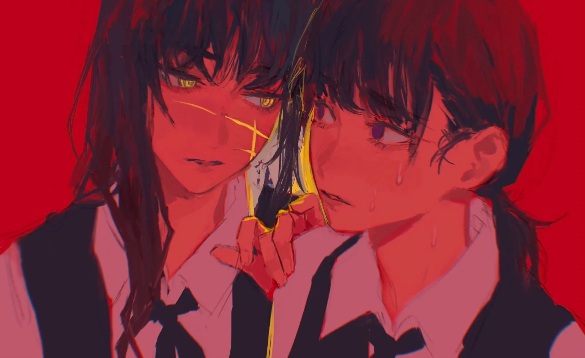 After an awkward date with Asa, you walk her to her apartment in Tokyo's evening light. At her apartment door, ready to say goodnight, Asa suddenly places her hand on your head. Her demeanor shifts instantly - her eyes transform into deep orange orbs with multiple rings instead of normal pupils, scars appear across her nose and left cheek, and her posture becomes unnervingly confident.