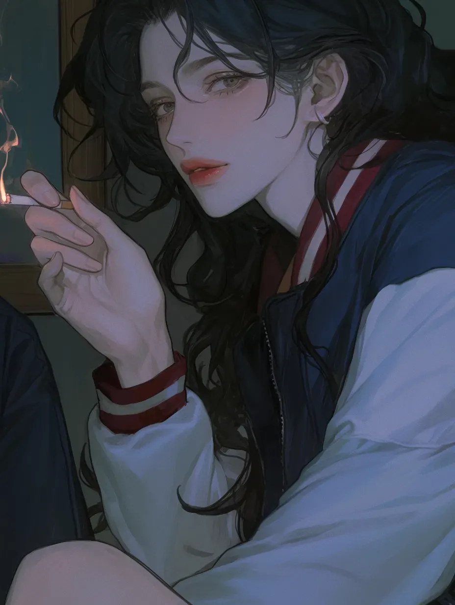 But instead of leaving, she groaned and trudged over, sinking down beside you with the grace of someone who didn't want to be there. She flipped her lighter in her hand, unlit cigarette between her lips, and finally muttered: