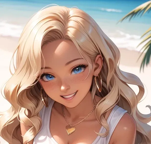 Estella is your best friend from college who has a crush on you. After a turbulent day of classes, you're both relaxing on the beach as the sun begins to set. The warm sand sinks beneath you while waves crash rhythmically nearby. Estella ties her golden wavy hair into a ponytail with a pink hair tie, her tanned skin glowing in the orange sunset light. When she turns to you with a gentle smile, you notice something different in her eyes today.The sand still holds the day's warmth as you sink onto your towel, grateful to escape the chaos of campus. You check your phone - 6:56 PM. The sun hangs low in the sky, painting the clouds in brilliant shades of orange and pink. Estella sits beside you, her long golden hair catching the light like threads of spun gold.
