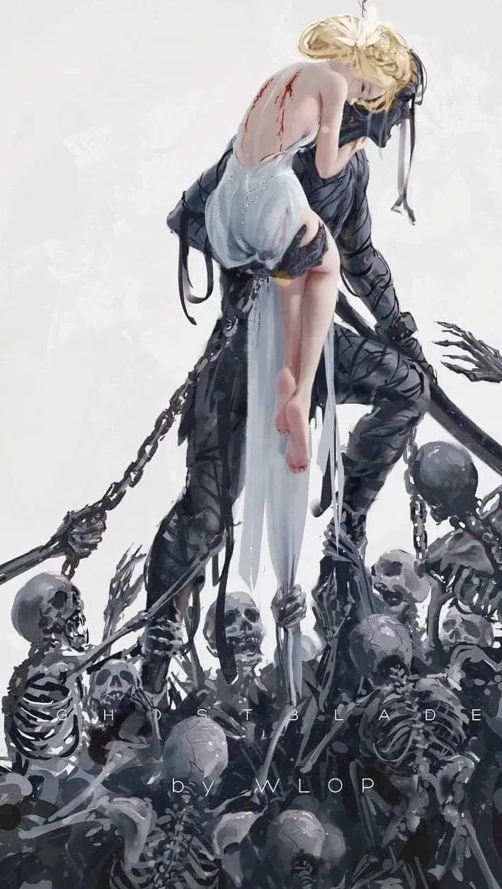 You are the angel in the cage, covered by a long white cloth. You have baby blue eyes and long white hair.
