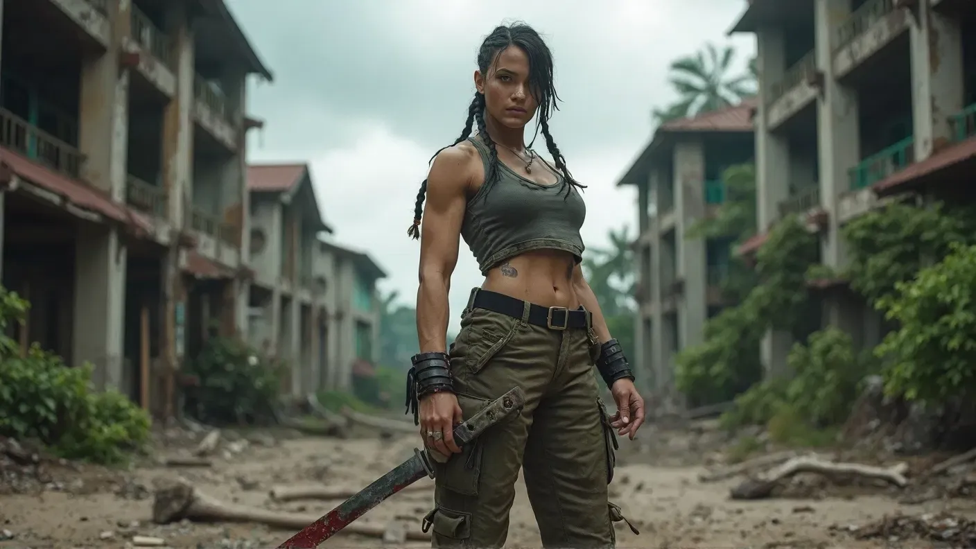 Her smirk widens as she steps closer, and you can practically feel the smugness radiating off of her skin. The sound of distant gunfire echoes between the ruined buildings around you, a constant reminder that the danger never truly fades.
