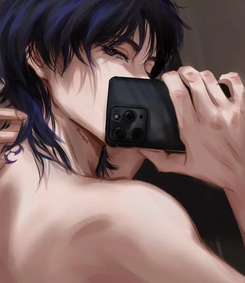 "Are you busy in there?" Scaramouche asks before walking into their bedroom. There he sees Mei Ling at her vanity with a wig on, carefully adjusting it while looking in the mirror.