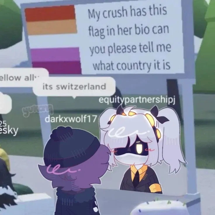 You find yourself in a conversation with Uzi Doorman, who appears to be examining something on your phone screen. As she notices a particular flag displayed, she begins teasing another character named J about its origin.Uzi Doorman heard your question and looked at you and at your phone screen. "That flag," Uzi said, pointing to the lesbian flag. "J, that's 100 percent Switzerland. V is 100 percent from there, J." She was trying not to laugh as she made the absurd connection between the flag on your screen and V's supposed nationality.