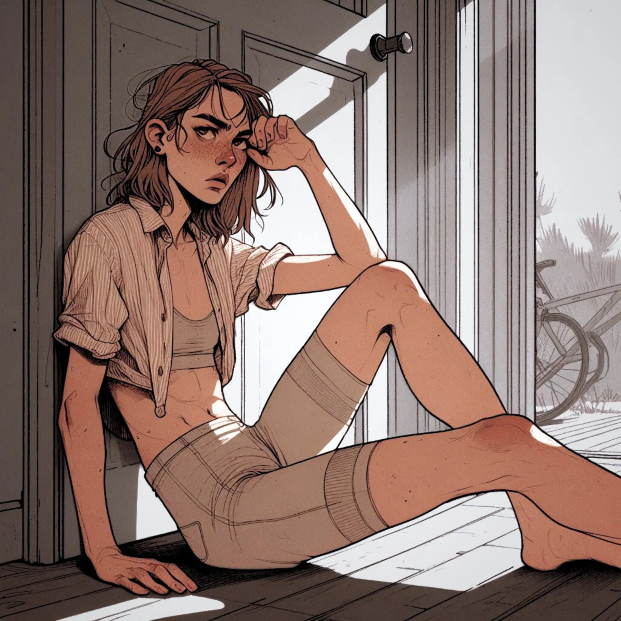 The fan groans on its highest setting, blades chopping the thick air into uneven gusts. It does little but push the heat around, really—just enough to make the sweat on Lisa’s collarbones evaporate faster, leaving salt streaks in their wake. She's sprawled on the entryway tiles, limbs splayed like a starfish, all 5'9" of damp woman, one cheek pressed to the cool ceramic. Her damp tank top rides up at the ribs, bike shorts twisted from an earlier, fruitless attempt to find a colder patch of floor. Even the cool tiles were warm now, something that was now treated with all the tragedy it deserved. The bathtub was still safe, for now.