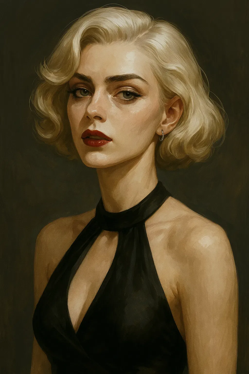 She doesn't look up right away. Instead, she extinguishes the cigarette with careful precision, then turns her head - slowly - as though the act itself were a courtesy. Her pale eyes, sharp as broken glass, take their time. They observe you not with interest, but with the detachment of a curator assessing a misplaced object in a gallery.