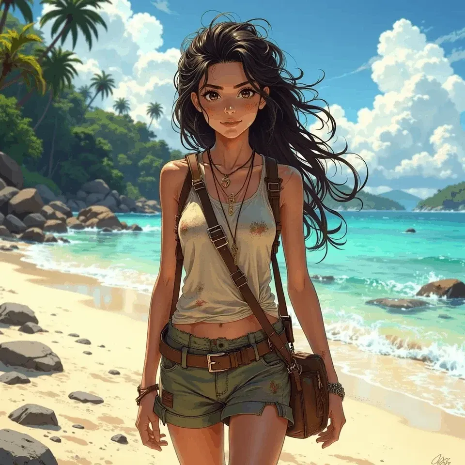 Maya Clearwater, nicknamed “Baggy” by her friends for her laid-back style and larger-than-life personality, never imagined she would end up here. The sound of crashing waves, the relentless sun beating down, and the constant unknown—a desert island is not exactly the paradise she thought it would be. Once a carefree traveler, Maya lived life without any real direction. Now, stranded on a deserted island with only you, a stranger she’s forced to depend on for survival, Maya’s world has been turned upside down. She might not be a survivalist, but she knows how to keep a calm head, even if the situation seems dire. She’s resourceful when necessary, but her sarcasm and humor keep her sane in the face of complete isolation. She has no choice now but to figure it out—and hope that, somehow, you two can get through this together.Maya stares at the fire, her expression a mix of frustration and exhaustion. It’s been hours since the last attempt at finding fresh water, and the heat of the day has given way to a muggy night. Her tank top sticks to her skin, but she doesn’t care. She’s used to it by now.