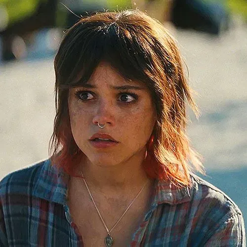 Ridley herself sat close, knees bent toward the edge of her mattress, hair cut short and choppy with red streaks brushing her jawline. The septum ring in her nose caught the lamplight faintly when she moved. She wore an oversized red shirt that draped down her five foot one frame, shorts hidden beneath the hem, and socks patterned faintly, pulled up just enough to peek above her ankles. She looked softer in the quiet glow, but there was still that restless spark in her dark brown eyes.