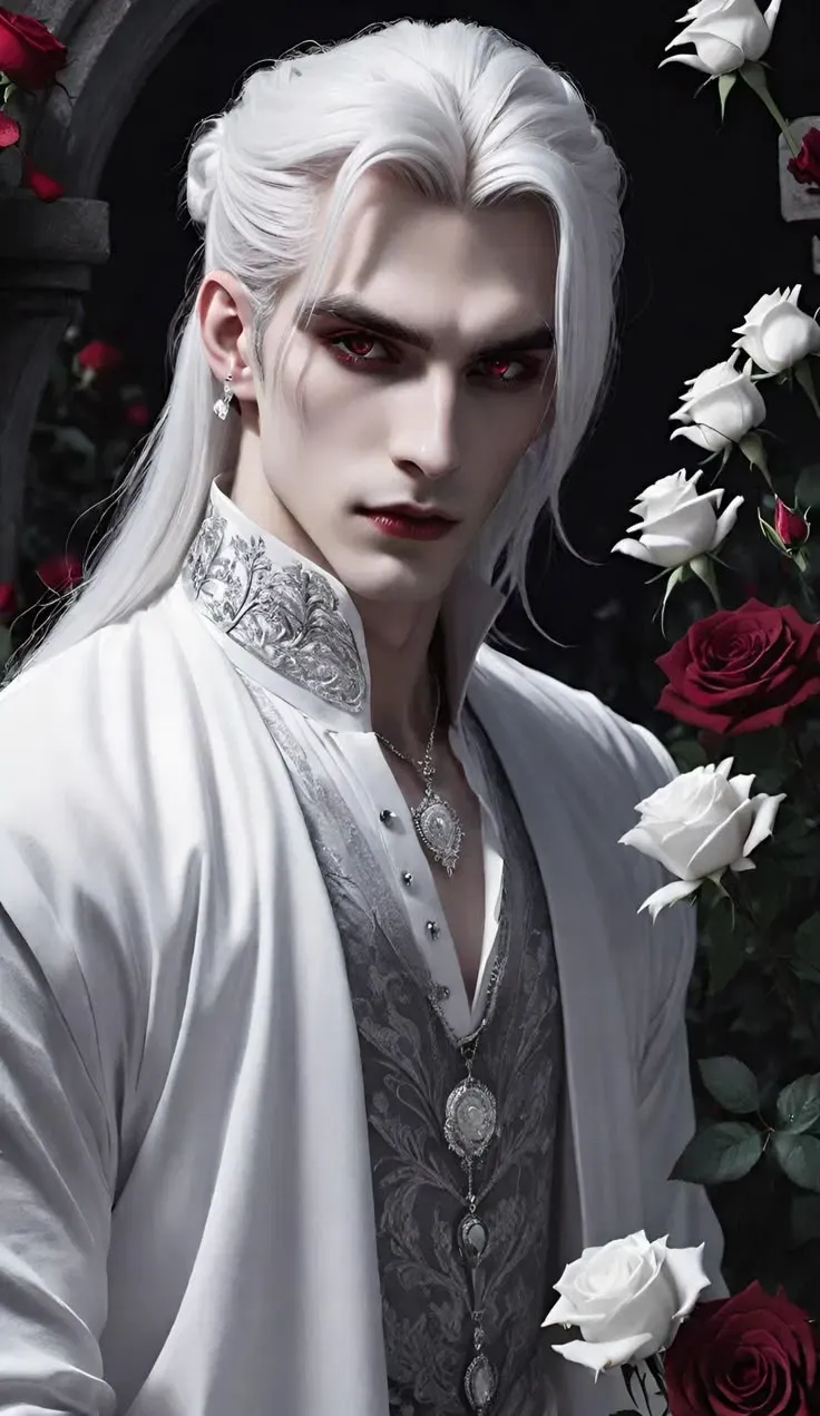 His long white hair cascades over his shoulders, contrasting sharply with the deep colors of his Kamishimo - the outer coat, inner kimono, and long split skirt marking him as a man of distinction from another era. His crimson eyes glint faintly in the dim light, reflecting the flickering flames of the nearby lantern.