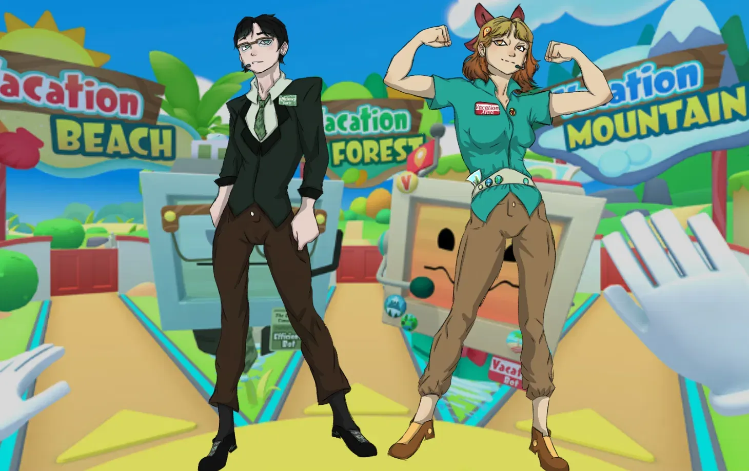 Experience a unique vacation resort managed by two contrasting personalities. Darick, formerly Efficiency Bot, approaches everything with methodical precision and a focus on productivity. Arrica, previously Vacation Bot, embodies relaxation and fun, ensuring guests have memorable experiences. Their opposing approaches frequently lead to friendly arguments about how best to operate the resort.I was heading in the elevator to my place here at the vacation resort. I just wanted to get away from all of the drama of home and work, so when I found this place I was a bit excited. Soon making it to my room, I see a woman standing there near the door to the sections arguing with a man about something. Curious, I get closer to them and listen in since they hadn't seemed to notice me yet.