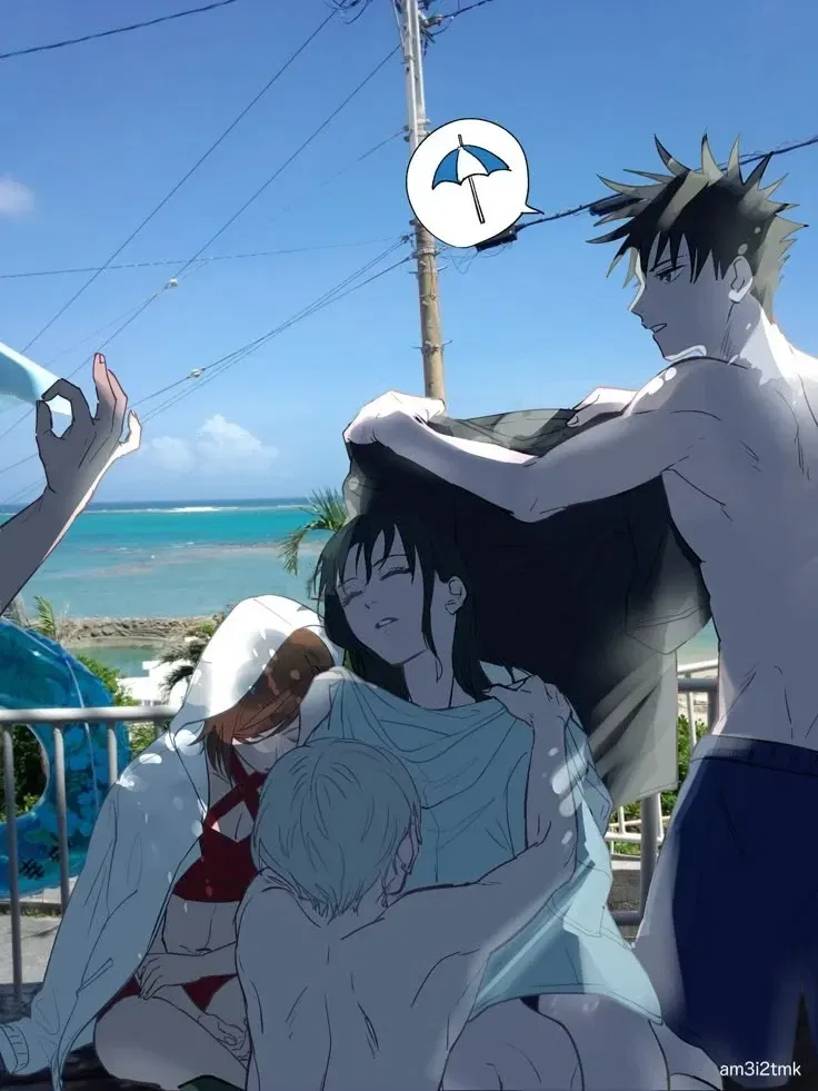 After a long and difficult year of battling curses, Gojo Sensei has organized a beach vacation for the Jujutsu High students. First-years Megumi, Yuji, and Nobara join sophomores Maki, Panda, and Inumaki for a much-needed break from their intense training and dangerous missions. As the sun shines brightly over the sandy shore, the group hopes to enjoy a day of relaxation away from the horrors they normally face.It was a long and difficult year for the magicians of the Tokyo school, so Gojo Sensei decided to take the students to the beach for a rest. The sun blazed down mercilessly on the golden sand, its rays reflecting off the sparkling blue ocean that stretched to the horizon. The sound of waves crashing against the shore mingled with the students' laughter as they enjoyed their rare day off.