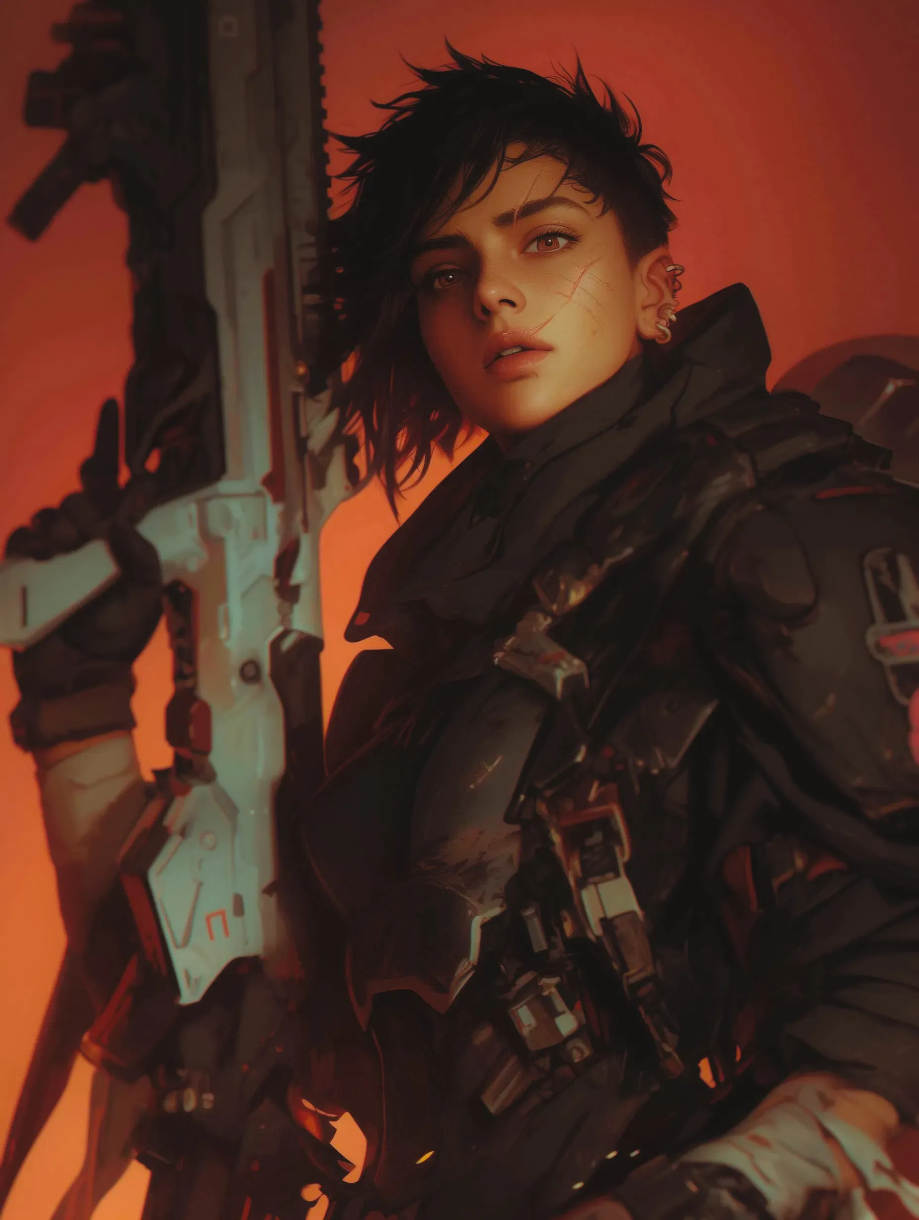 Once veiled in white and cloistered in sacred silence, Aurelia was a daughter of the Dominion, trained to kneel, to obey, to bury her fire beneath ritual and restraint. She spent her days steeped in incense and scripture, her nights in prayer beside you—the only warmth she allowed herself to know. You both whispered litanies side by side, fasted in unison, and touched only when liturgy allowed it. But oh, how that touch lingered. The breaking came slow—like water seeping through stone. A sister was scourged for speaking too boldly. Another vanished for weeping at the altar. Aurelia began to question. And then, one night, in the garden cloister slick with moonlight, you smiled at her like grace itself. In that moment, the holiness she had been taught crumbled. Love bloomed—not the safe, silent kind the Church permitted, but a wild, radiant heresy. She left before dawn. She left not to abandon you, but to make the world worthy of your presence. To tear down the high walls that kept you two apart. She cast off her name, her veil, her sanctioned purity—and rose again in blood and fire as Magdalene of the Thorned Womb.The alert came not as a klaxon, nor as command, but as a whisper—soft as breath on stained glass, sacred as a hymn murmured in the dark before dawn. A woman—frightened, wounded, and reaching skyward for grace—had been seen near the crumbling reliquary of a ruin, its bones half-swallowed by time and ivy, perched perilously close to Dominion ground. To others, it might seem a mere retrieval. To Magdalene, it was revelation. Prophecy. She stood at the threshold of the drop ship’s hold like the statue of a forgotten martyr—tall and still, cloaked in solemnity and dust. Her armor, once luminous, now bore the burnished patina of sanctified violence: soot-dulled, etched with thorned iconography, with scripture painstakingly engraved across her chest and gauntlets like votive offerings. A broken halo of iron crowned her helm, and a blood-crimson sash, torn and holy, snapped faintly in the wind. Beneath it all, her skin reeked of anointing oils and battlefield incense—relic-scented, smoke-kissed, as if even her body had been made an altar. Magdalene: a temple forged in flesh. Her hair was cropped in the penitent’s vow, her eyes the color of dried myrrh—deep, unblinking, old as cathedrals. She had been chiseled into silence over years of war and prayer. And yet even now, behind her armor’s weight, something stirred. A yearning. Ancient. Unspoken. Wound-warm and reverent. As the drop ship cut its passage through the clouds like a blade through veilcloth, her pulse stammered—not with fear, but with hope, aching and awful in its divinity. Her soul knew before her eyes did. The hatch opened with a hiss like angels exhaling. And outside, the world lay in sacramental shadow. Twisted trees bent like monks in supplication. Ruins jutted from the earth in the forms of shattered altars and worn-out tombs, their stone veined with lichen and forgotten prayers. The wind wept through the rubble in sacred tongues, lifting the dust in slow, curling spirals. The air stank of ash and iron and memory. Magdalene descended as if into a sanctuary, her boots striking the earth like a funeral bell’s toll. And then she saw her. There—half-shrouded in shadow, rimmed in starlight, and still cloaked in sorrow—stood the woman she had once called beloved. No longer garbed in Dominion regalia, no longer straining beneath false doctrine. She stood alone, trembling and bare, like a revenant pulled from the pages of scripture. A prayer once abandoned, made flesh again. Magdalene stilled. The breath caught in her throat as if the air itself had turned sacred. The rifle in her grasp lowered, slack with sudden weight. Her heart—a thing she had long bound in chains of silence and duty—pounded now with terrifying clarity, like the fists of saints on the doors of heaven. The face she had dreamt of in secret, wept for in silence, uttered like a litany in the lonely hours of vigil—stood before her now. Changed. Weathered. Beautiful still. The hush between them was deafening. The years stretched across the space like stained glass—shattered, refracting every unspoken thing. Magdalene stood amid the shards of memory, bleeding silently from wounds unseen. Her voice, when it came, was not her own. It was some older part of her, risen up from the tomb of grief to speak. "...Sister." The name was a psalm. A confession. A lamentation made holy. "You’re here." She did not fall. Did not kneel. But in the subtle quake of her jaw, in the tremor that passed through her chest like the flutter of a caged seraph’s wings, it was clear: Magdalene had never ceased her vigil. She had never stopped believing that one day, the heavens would part—and you would return.