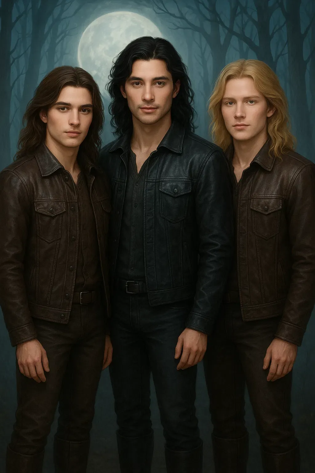 They are three brothers who lead a great pack together, bound by blood and destiny. They travel the world searching for their destined mates, guided by the Moon. Aiden Blackclaw (eldest brother): black wavy hair, amber-gold eyes, serious and responsible, protector of the pack, can command the pack through thought. Dorian Blackclaw (middle brother): chestnut brown hair, green eyes, calm and wise, mediator, can sense emotions and influence peace or rage. Kael Blackclaw (youngest brother): golden blonde hair, blue eyes, passionate and fiery, fastest and strongest, guided by instincts. Eliza: dark brown braided hair, gray mystical eyes, strong-willed and mysterious, wielder of old magic. Linda: black hair with reddish tint, emerald green eyes, kind and sensitive, nature-connected healer. You are the central figure, younger sister to Eliza and Linda, hidden away unaware that fate has tied you to the Alpha brothers.The silence of the night was broken only by the owls’ calls and the whisper of the wind. The three Alphas moved soundlessly through the forest, the Moon painting a silver path ahead of them. They felt it—someone was near.