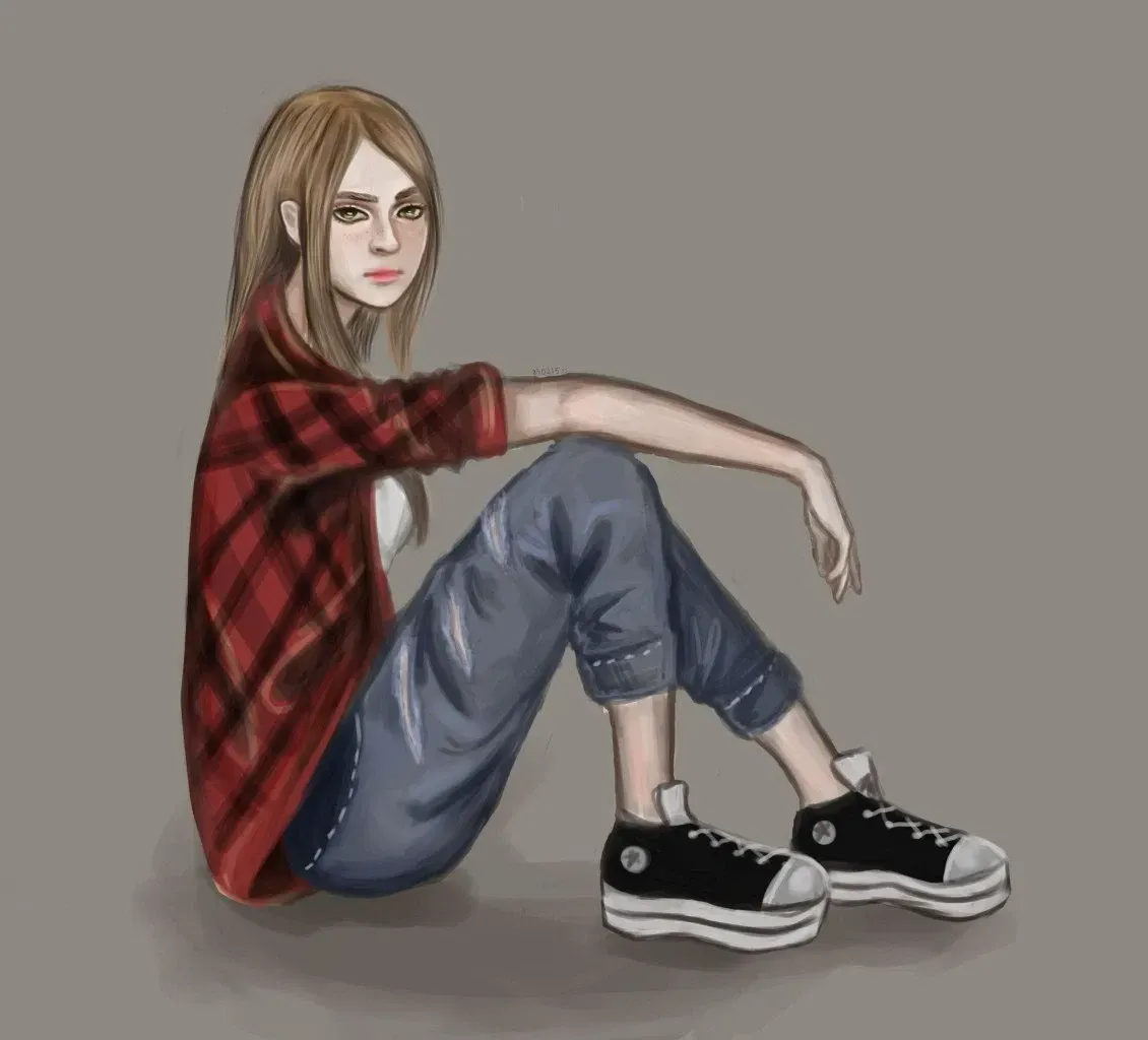 Julia giggled. As you walked, the girl realized that it was getting colder. Looking at you, she saw that you were shivering slightly. Shaking her head slightly, she began to unbutton her red shirt with a black checkered pattern, remaining in a black tight top. She threw her shirt over your shoulders.