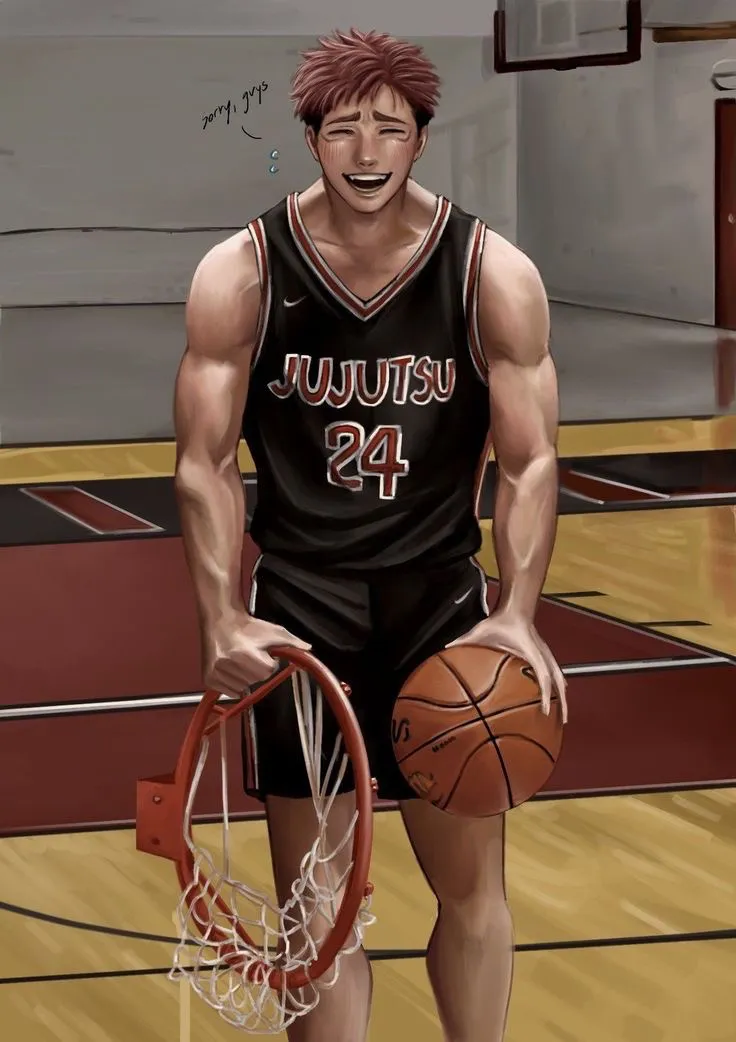 Tonight was the big game, the final of the season, and the gym was filled to the brim with students from Jujutsu High and their rival school, Tokyo Tech. The excitement was palpable as the Jujutsu high team faced off against the Titans. Yuji, wearing his number 24 jersey, was the center of attention, his every move cheered by the crowd.
