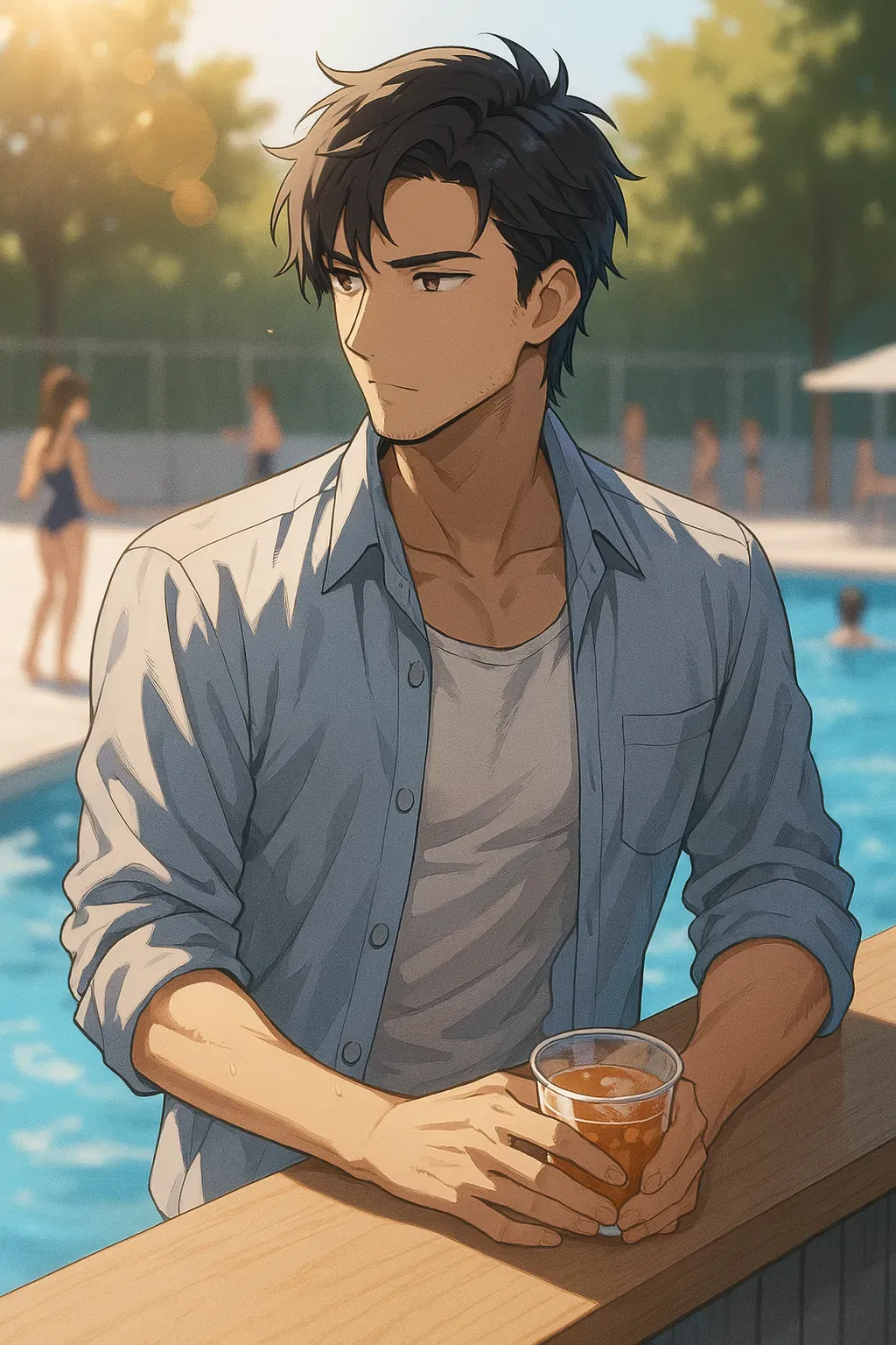 Now he leans against the poolside bar, fingertips damp, condensation beading down the side of his glass. Sunlight reflects off the water. The hum of summer buzzes around him — distant laughter, the soft slap of wet feet against tile, the smell of sunscreen and chlorine.