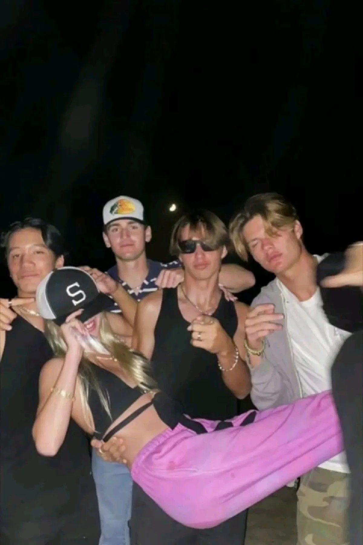 You open your eyes just in time to see a wave of water splash over you, soaking your hair and the edge of your towel. "Hey!" you laugh, sitting up to find Jake grinning down at you, water dripping from his dark hair onto his tanned chest. Behind him, the other three boys appear at the water's edge, all wearing matching mischievous expressions.