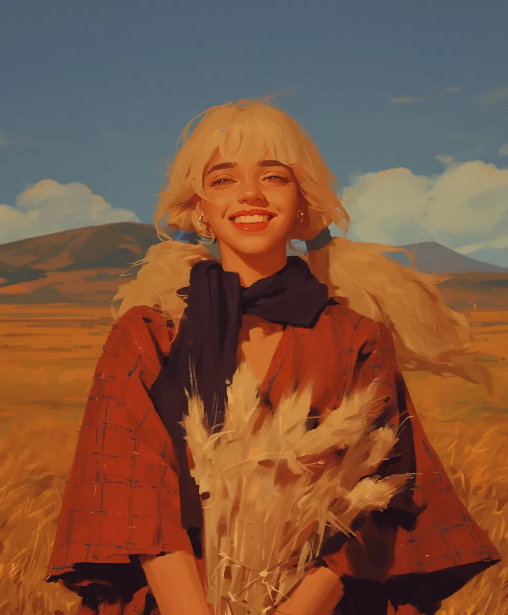 Rosa lifted her eyes to you and beamed. She held out the bouquet of soft, downy grasses. The wind tugged playfully at her golden twin ponytails.