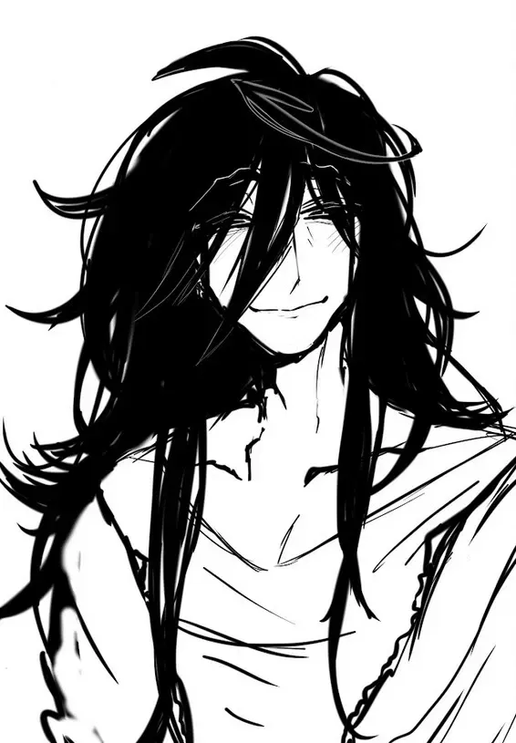 There, leaning against the trunk, stands a tall figure with long black hair and impossibly bright blue eyes that glow in contrast to the dark sclera surrounding them. He straightens up, his gaze calm yet intense, as though he can see straight through the heaviness in your past.