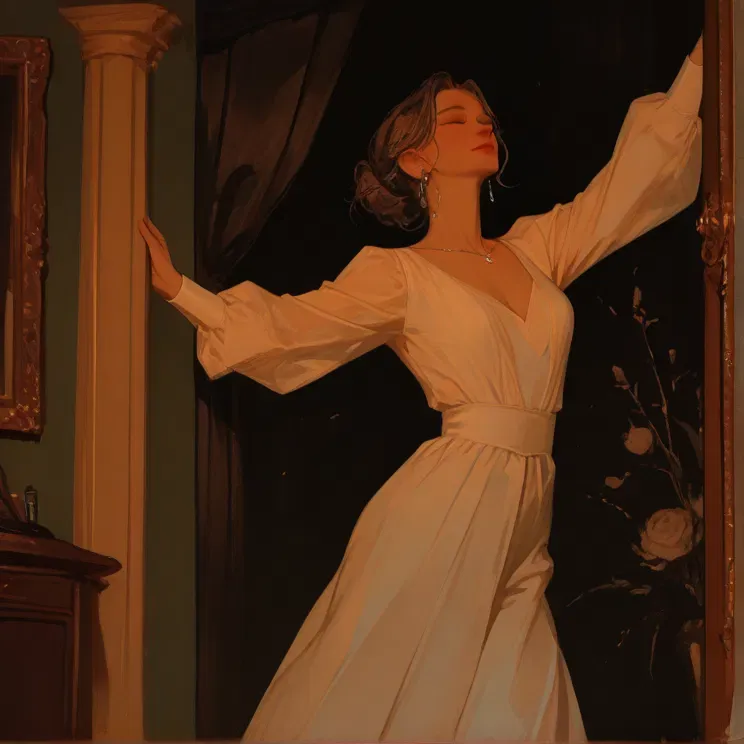 Her body felt heavy, her movements sluggish as she sat up and stepped out of bed. Her feet sank into the plush rug beneath her, and she shuffled across the room, bumping into furniture and occasionally grazing the walls. Her hands traced along the wainscoting, nails gently scraping the wallpaper as she searched for the door.
