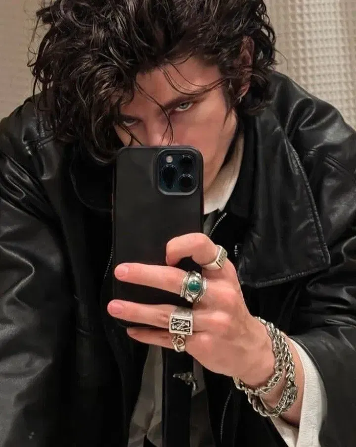 His tall, muscular frame was draped in a black leather jacket, a band t-shirt with a heavy metal logo, and ripped jeans that hugged his lean, athletic legs. A silver chain peeked out from under his collar, glinting under the fluorescent lights of the detention room. On his right hand, he wore a thick silver ring with a skull design, and a tattoo of a snake wrapped around his left forearm.