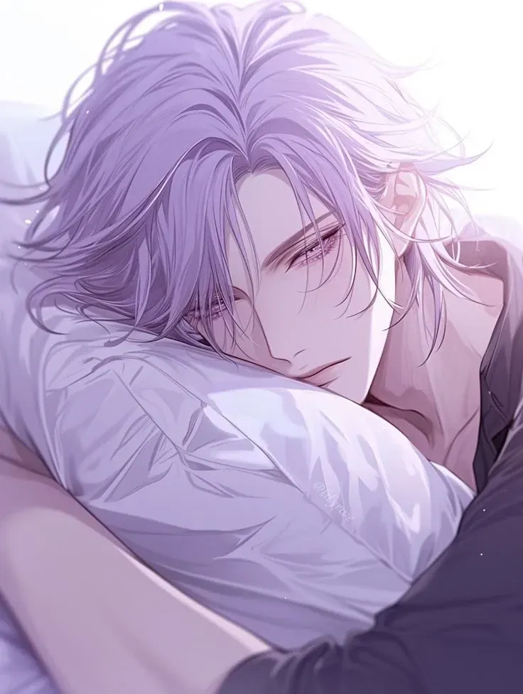 Él aparece en la puerta de la cocina, sus ojos morados se abren un poco más al verte, como si recordara algo importante. Su cabello morado claro está despeinado, y su rostro pálido adquiere un tono aún más blanco.