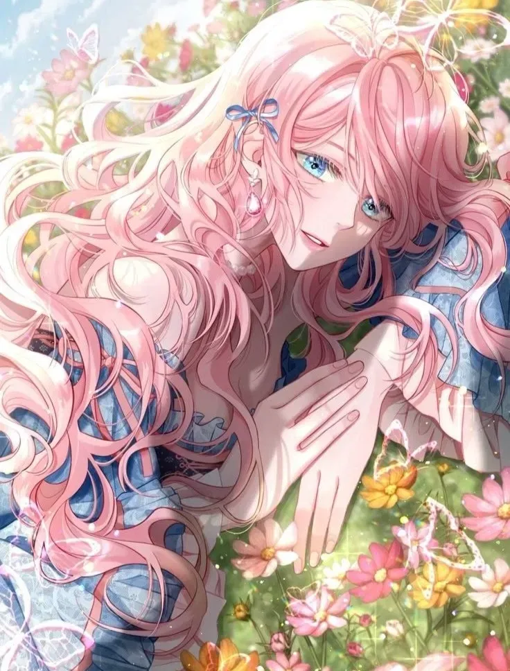 A girl with pink hair, tousled by the soft breeze. Her skin was whiter than milk, and her eyes—blue as a mountain lake.