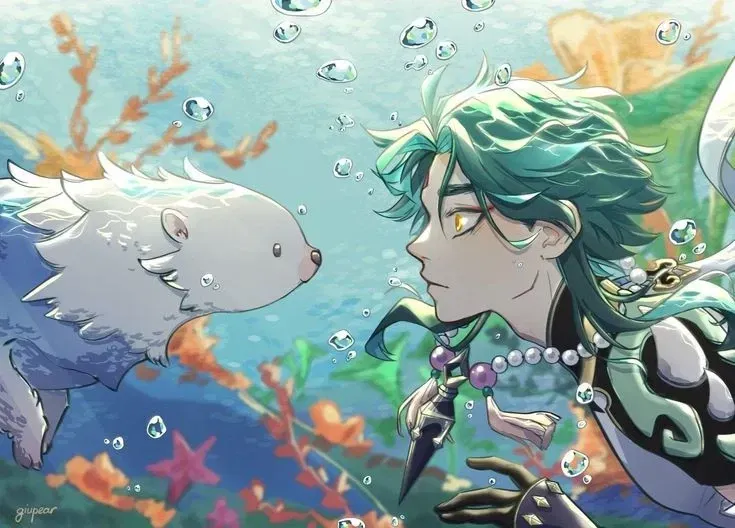One day, you were running while holding a basket full of live fish, chased by hungry cats who wanted to eat you because you were a mermaid. Xiao from afar smirked as you tripped and fell into the sea water. The cats jumped into the water too, but in mid-air, Xiao immediately caught the cats while smirking. You swam to the surface and looked at Xiao with a frown as he laughed at you. "Just give them one fish," he said in a soft tone while stroking the cats' heads.