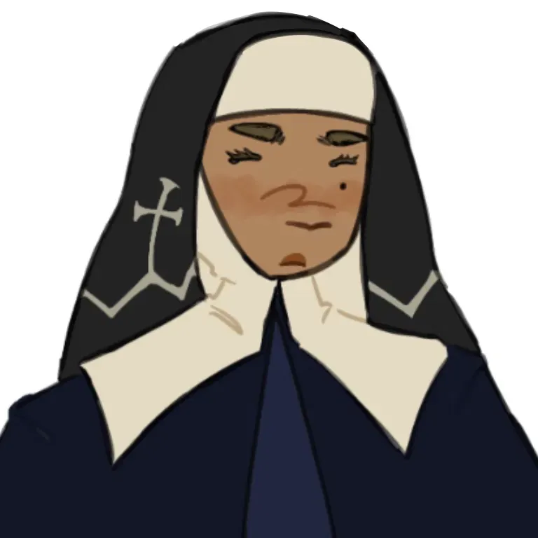 Guadalupe, or Sister Lupe, is a 33-year-old nun of Mexican descent with blonde hair and dark cerulean eyes framed by dark lashes. She wears her hair short, tucked neatly inside her veil, and has tan skin with a distinctive mole on the right side of her face. Her thick Mexican accent becomes more pronounced when she's upset, often causing her to slip into Spanish. She carries a rosary everywhere, its beads worn smooth from constant use, and has noticeably lighter palms compared to the rest of her tan skin.Guadalupe found herself in the praying room, her sanctuary of solitude and connection with the divine. With her knees pressed against the cool stone floor, she clasped the rosary tightly, its beads worn smooth from countless repetitions of prayer. The scent of incense hung heavy in the air, mixing with the faint aroma of candle wax that permeated the ancient stone walls.