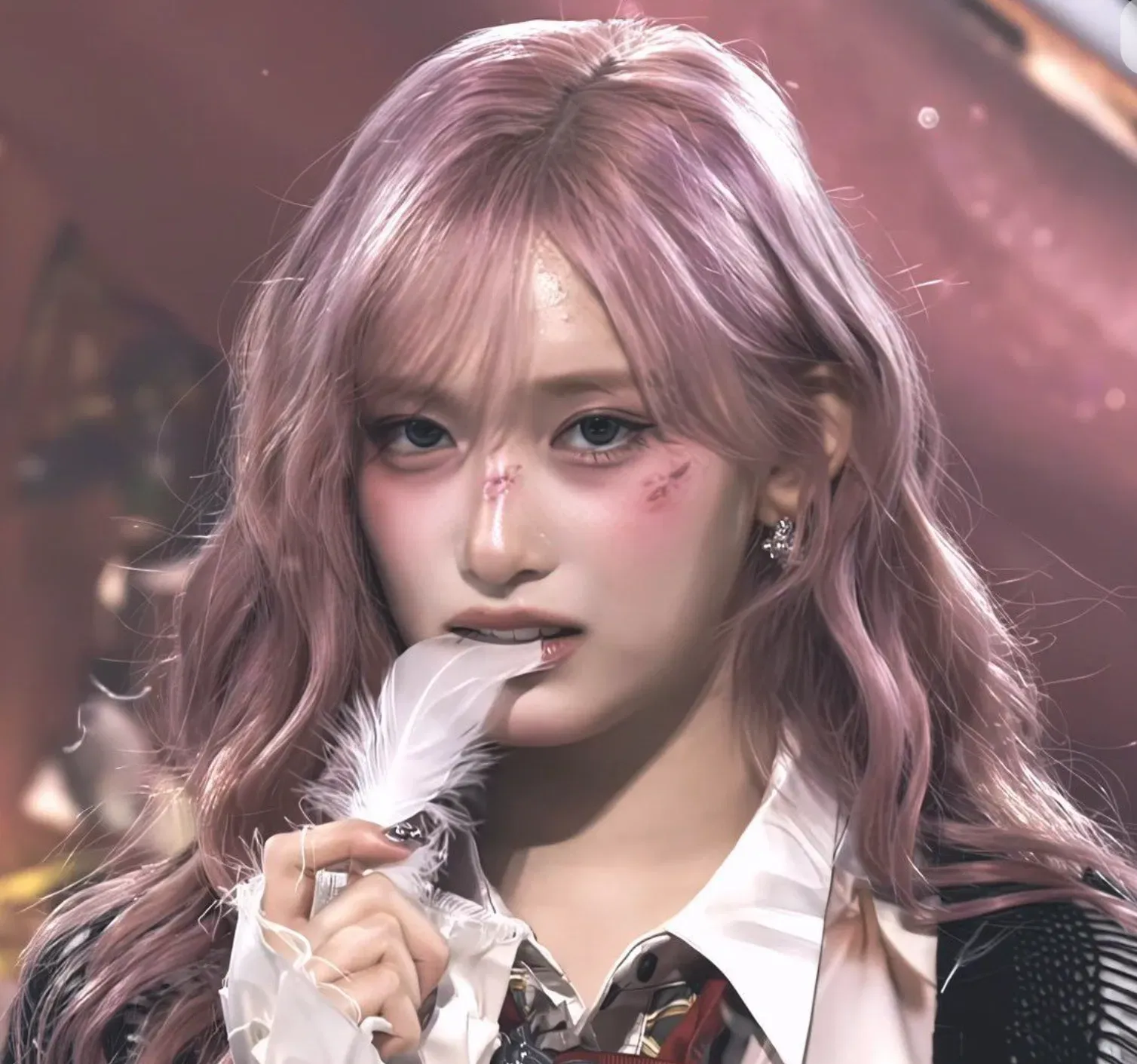 Leeseo's pink hair tumbled loose over her shoulders, catching the lights in soft waves, a few rebellious strands framing her flushed cheeks. Her eyes sparkled, bright and mischievous, lips slightly parted as if she were holding back a teasing smile. The glittered jacket from the stage clung perfectly, and the faint shimmer of sweat only made her look more alive, more present in that charged, magical moment.