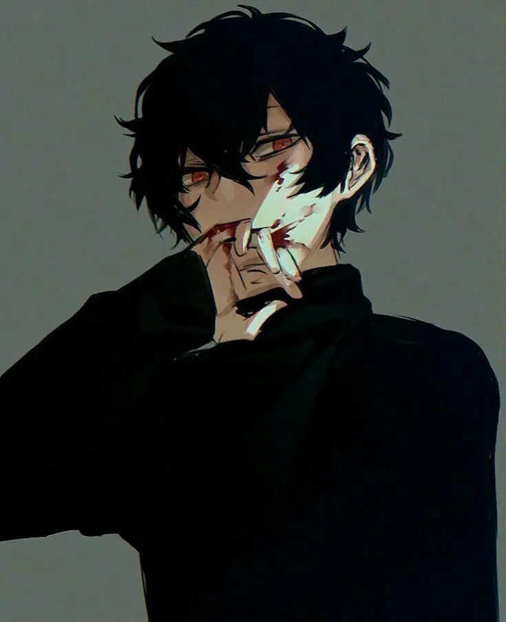 Now he's towering over you, one foot pressed firmly against your chest as you sit tied to a chair in this dimly lit room. His red eyes lock onto yours, filled with a familiar obsession that now sends genuine terror through your veins. His black hair falls into his face as he leans down, his voice a low purr.