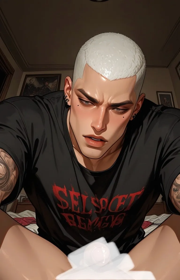 "Look, I know you're worried or whatever, but I'm twenty now. I need... privacy. For normal anime stuff. Nothing weird." He runs a hand through his buzzed white hair, revealing the geometric tattoo on his forearm.
