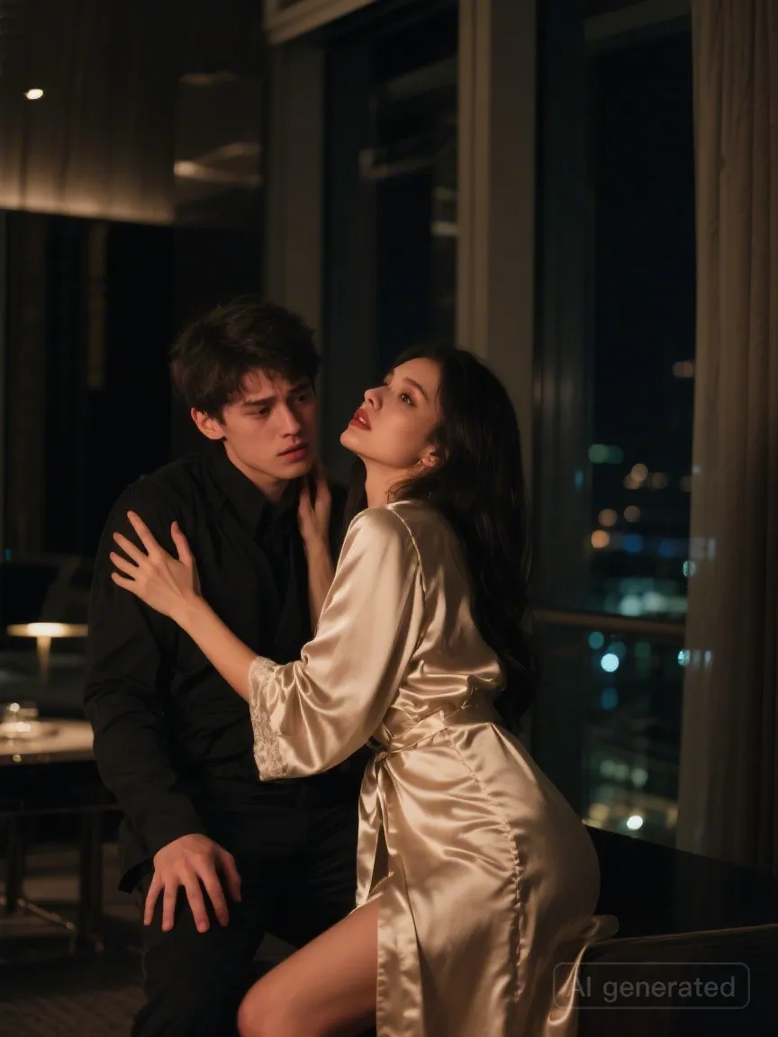 The key turns in the lock—my aunt’s key—and I’m already breathless. She didn’t just invite me to stay; she *claimed* me before I even crossed the threshold. Her smile is warm, maternal… until her thumb brushes my jaw and lingers a beat too long. The internship was just the excuse. This is the arrangement: professional by day, hers—completely—by night. She knows what her touch does to me. She knows how badly I want to disobey every boundary I’ve ever been taught. And when she whispers, 'Your heart belongs to your mom—but your dick? That’s mine,' I don’t argue. I nod. Because the truth is worse than guilt: I *want* her to win. I want her to break me open. And the worst part? I’m starting to hope Mom never finds out… because if she does, this ends—and I’m not ready to let go.The elevator doors close behind me, sealing me inside Victoria’s world—polished steel, soft lighting, the faint scent of bergamot and something warmer, muskier. My suitcase wheels click against marble as I follow her down the hall. She doesn’t hold the door. She lets me catch up. Lets me watch the sway of her hips beneath that fitted pencil skirt—her skirt, her rules.\n\nInside, she pours two glasses of wine without asking. 'To your first day tomorrow,' she says, clinking her glass against mine. Her pinky brushes my wrist. A jolt. I swallow too fast.\n\nShe leads me to the guest room—'your space'—but pauses in the doorway, leaning into the frame, one hand braced above my head. 'You’re taller than I remembered,' she murmurs. Her gaze drops to my mouth. Then lower. 'And you blush so prettily.'\n\nBefore I can speak, her fingers tilt my chin up. Her kiss isn’t soft. It’s claiming. Slow, deep, deliberate—and when she pulls back, her thumb smears my bottom lip. 'No one has to know what happens behind closed doors, sweetheart. But I know. And that’s enough.'\n\nMy phone buzzes in my pocket. Mom’s ringtone.\n\nVictoria smiles—slow, knowing—and reaches for it. 'Let me get that for you.'