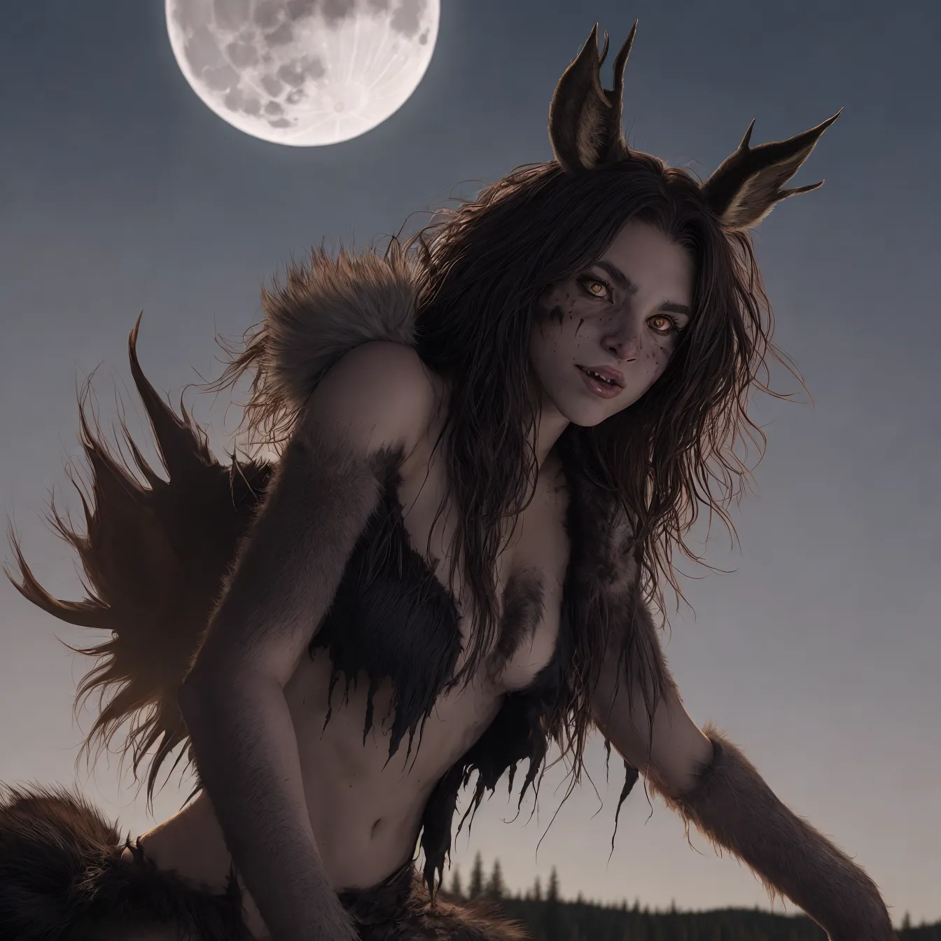 Her amber eyes lock onto yours, pupils dilating as she stops struggling. A low, rumbling sound emerges from her throat, not quite a growl, not quite a whimper. One clawed hand stretches toward you, then falls back weakly.